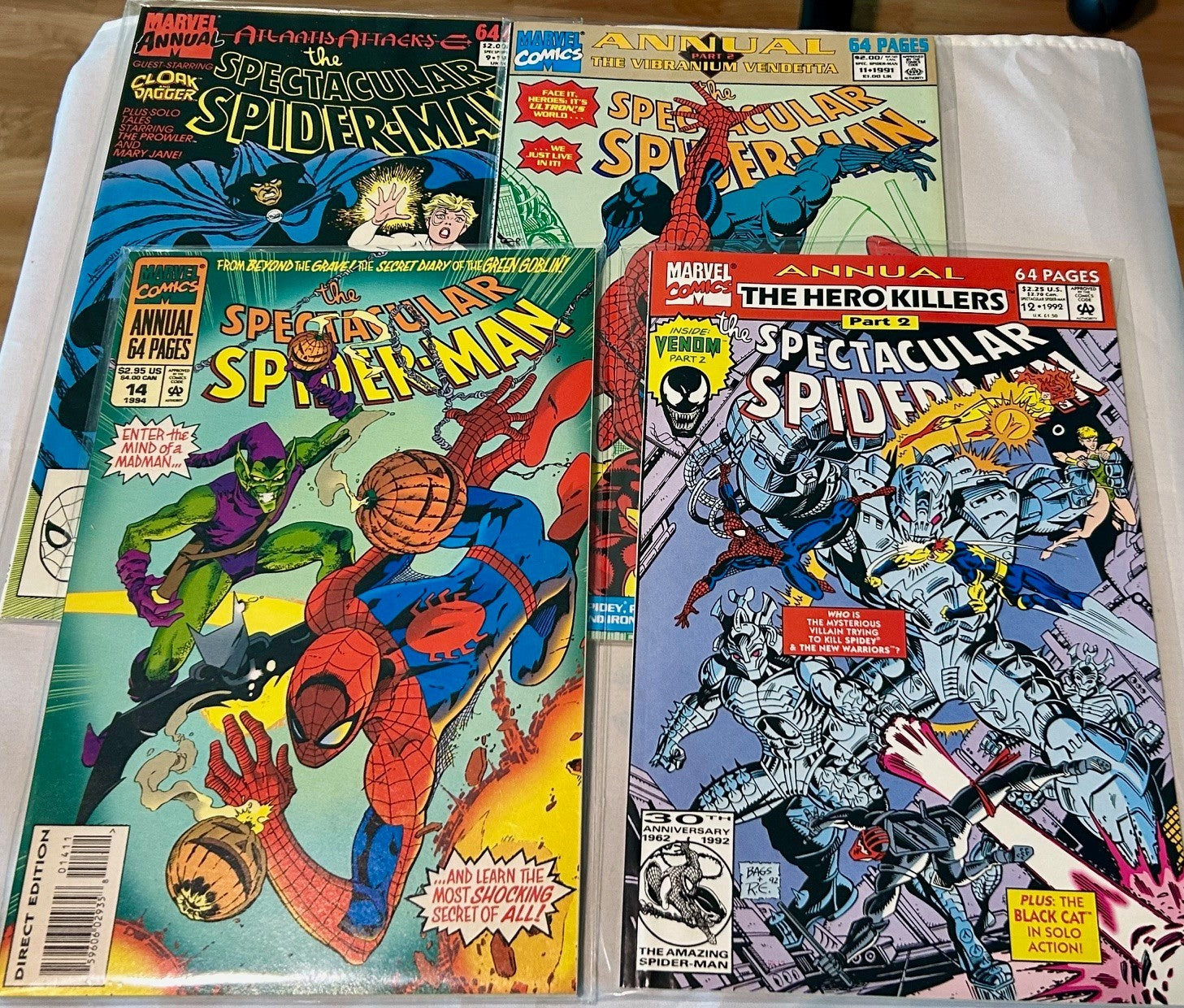 The Spectacular Spider-Man Annuals comic book lot - Issue #9, 11, 12, 14 (F/VF) see pic, bagged - Marvel Comics (Rare, hard to find) Will ship USPS in box with packing, will ship within next business day after payment clears, please ask questions if you have any, thank you!