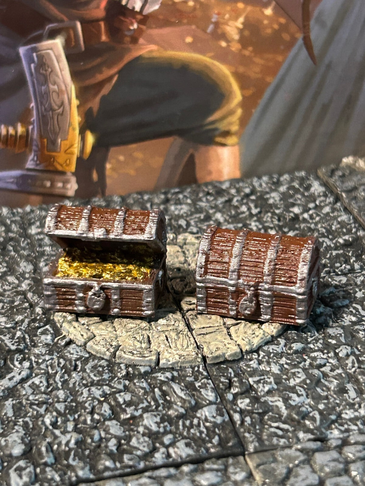 1 Ea - New / Unused - 2 pc Wooden Closed and Open Treasure Chest w/ Gold miniature (2 painted printed plastic, Approx 1 inch cubed, rpg gaming terrain piece / custom made)