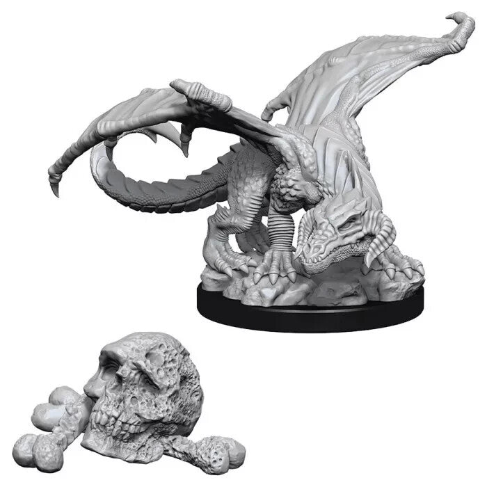 1 Ea - D&D / Dungeons and Dragons miniature - Wiz Kids / Nolzur's - Black Dragon Wyrmling and Skull - 2 pack - W10 - (Unpainted plastic, medium 1 in base) - New / Sealed