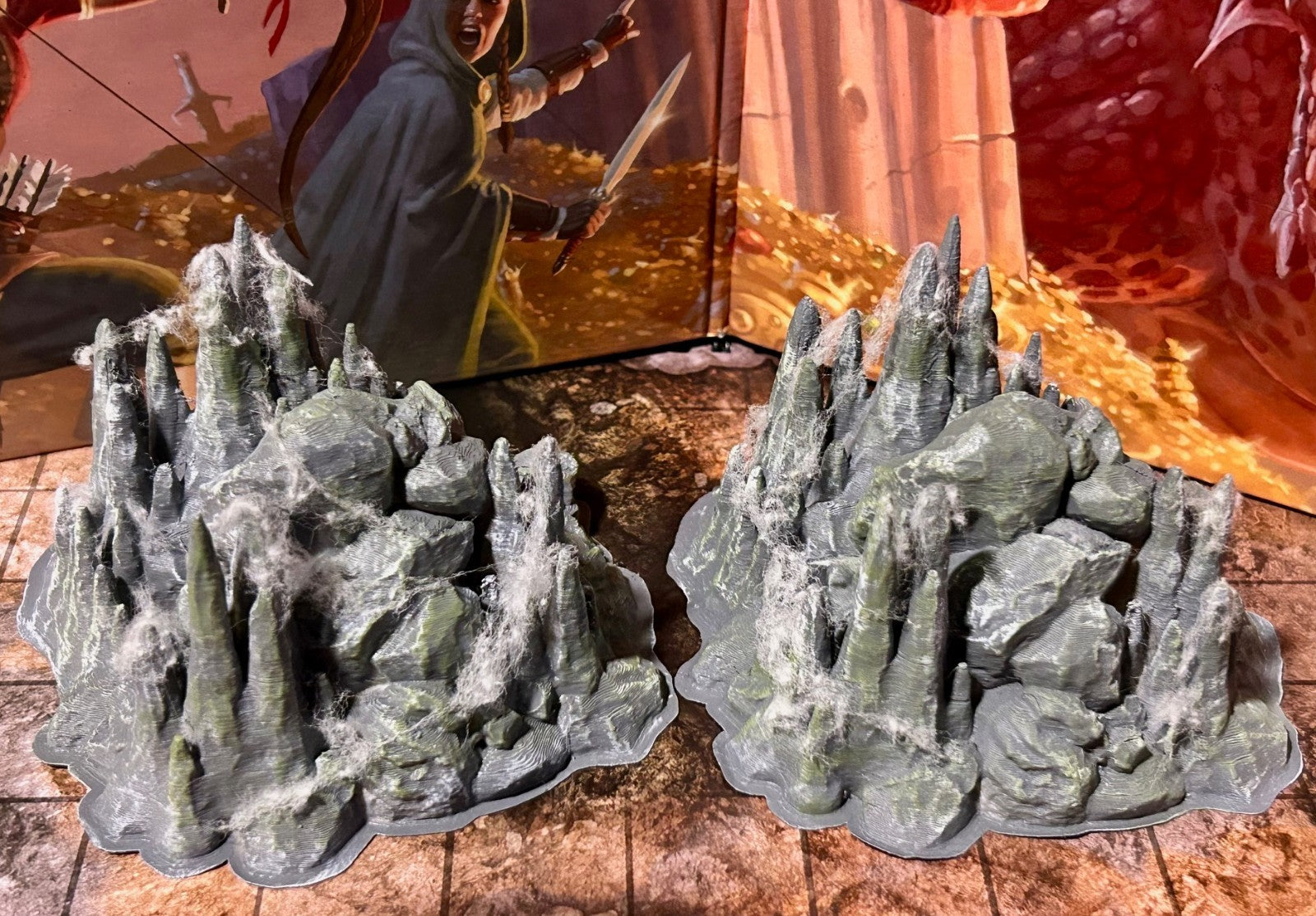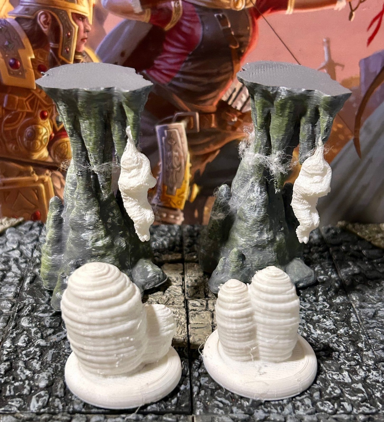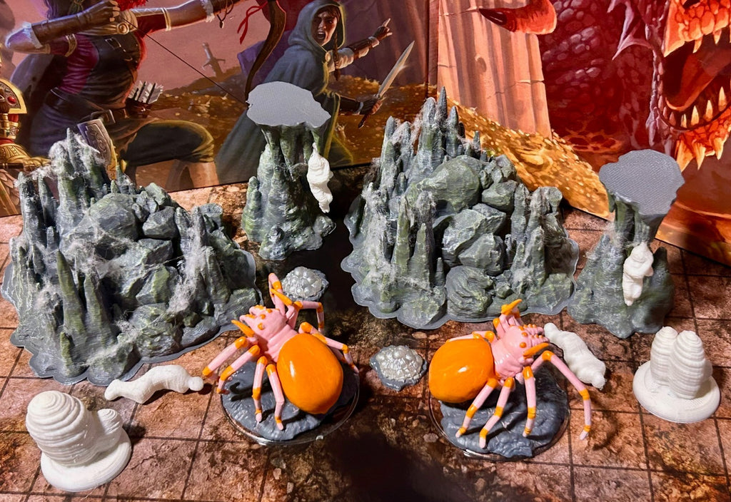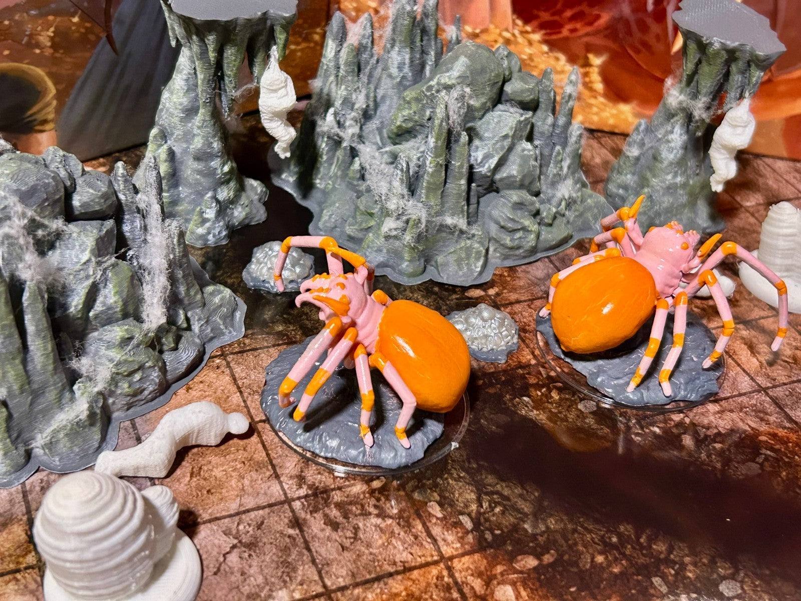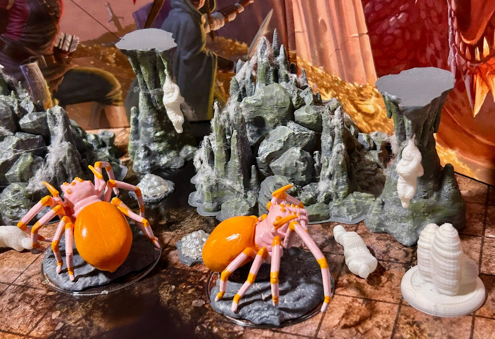 - Includes 2 Large Custom Painted Giant Spiders (size large bases), 2 huge sized painted Stalagmite Rock Formation pieces, 2 size large painted rock columns with hanging webbed victims, 2 webbed medium sized rock formations, 2 webbed victims on ground, and 2 small painted spider egg clusters