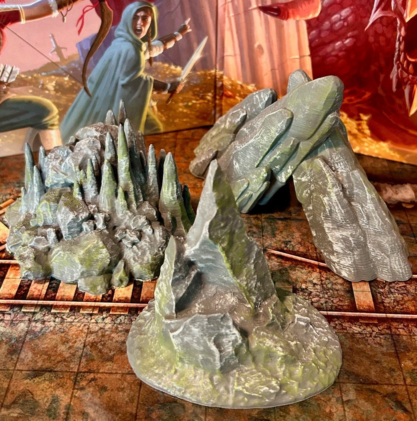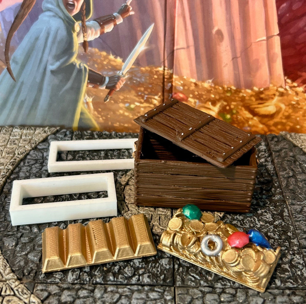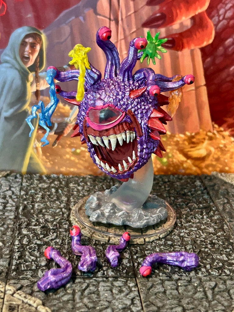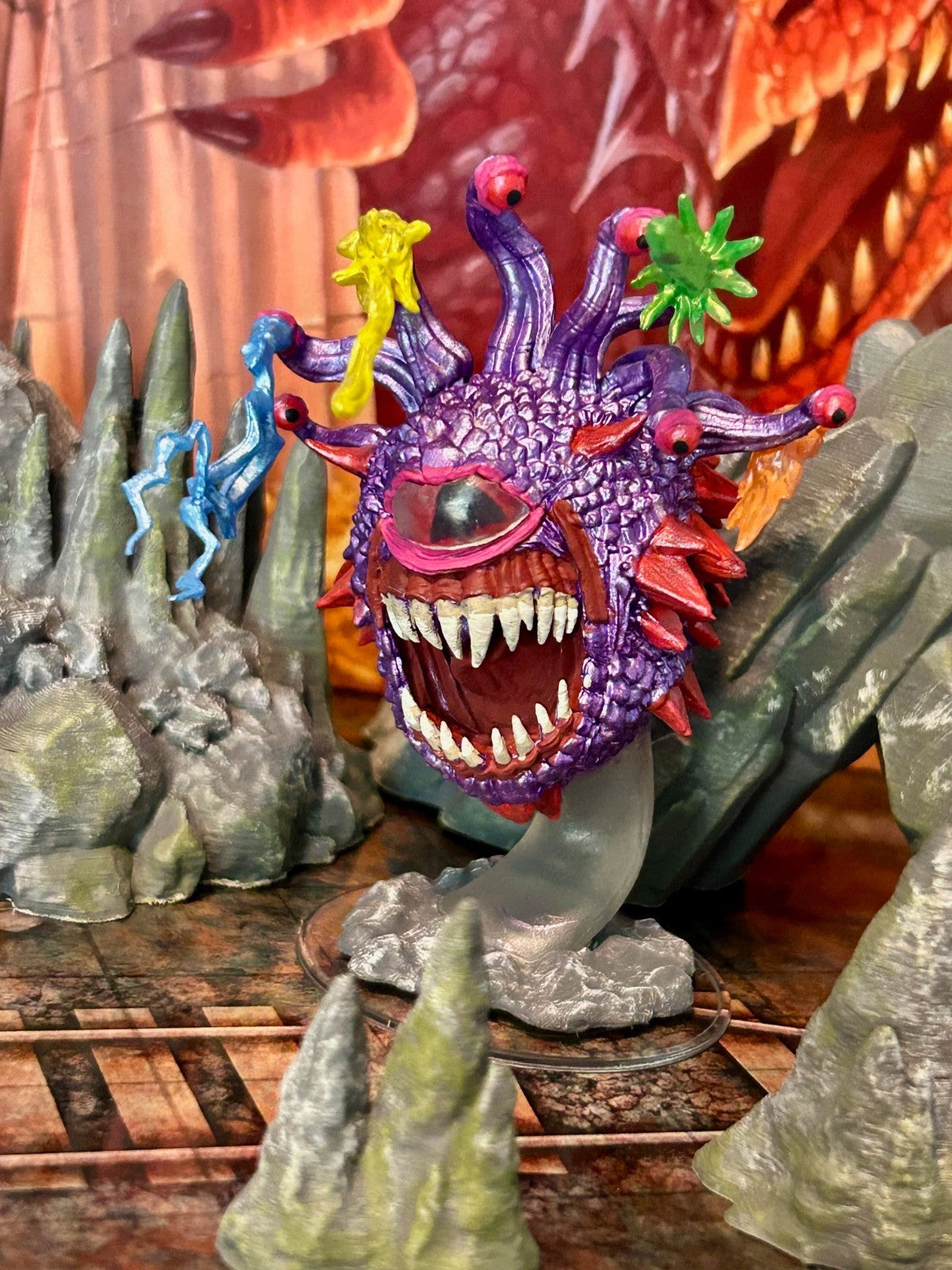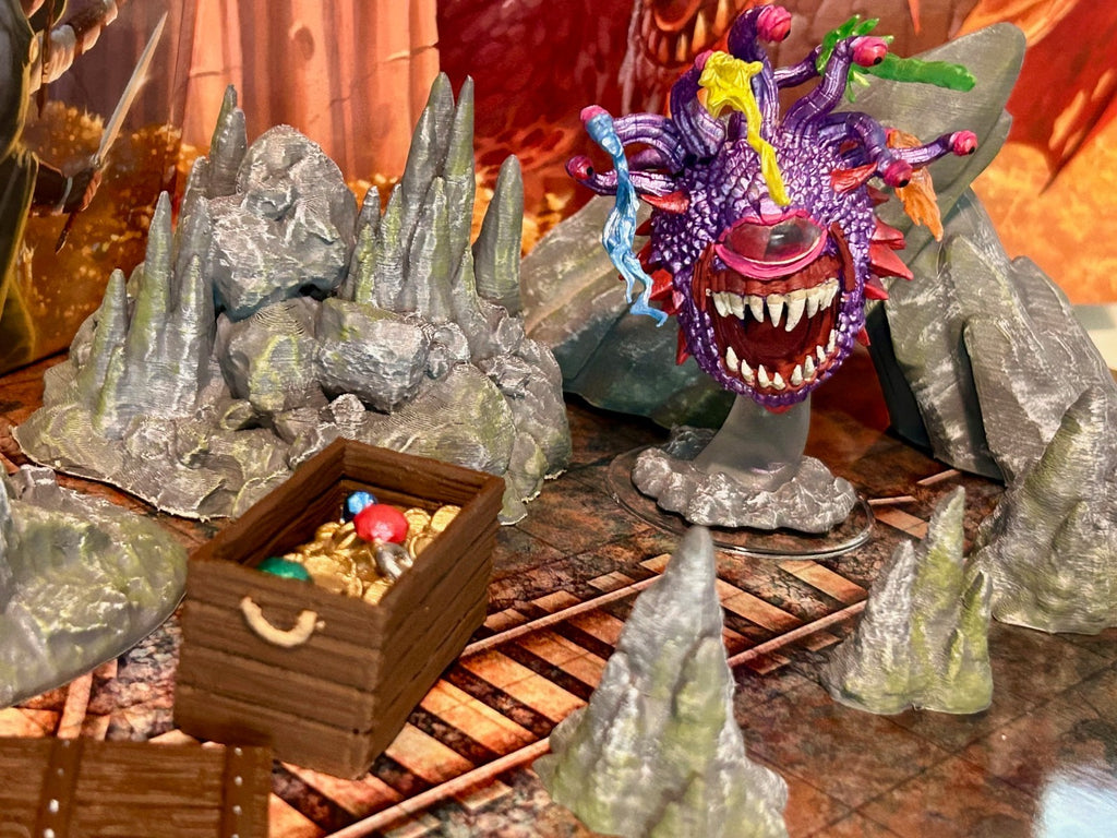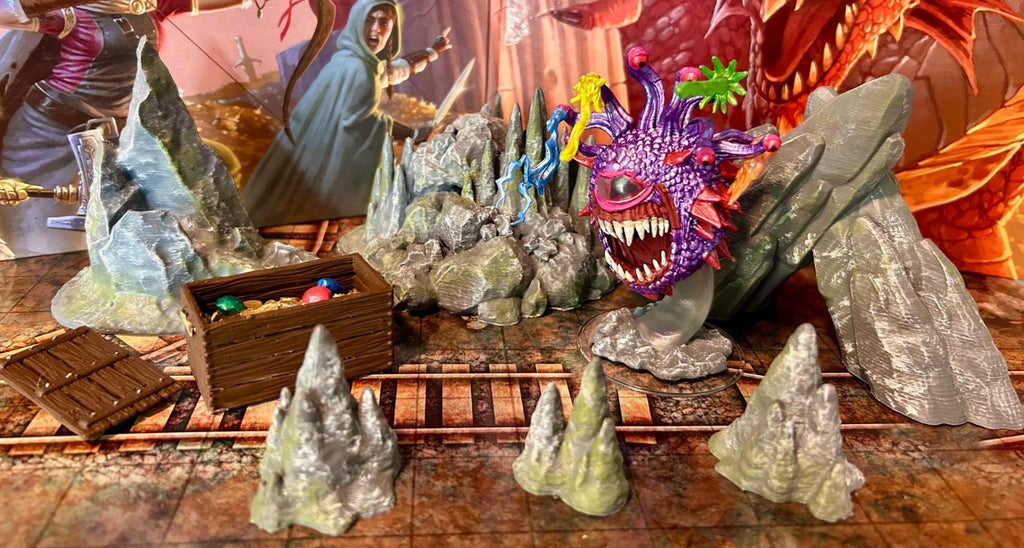 - Includes 1 Large Custom Painted 9 pc Beholder (4 removable eye stalks and 4 add on magic effect eye stalks, interchangeable), 3 painted small / medium painted cave stalagmite pieces, 3 huge painted cave rock clusters, 1 painted 6 pc Treasure Chest Crate (with 2 inserts, crate, lid, gold bar layer, and treasure pile layer)